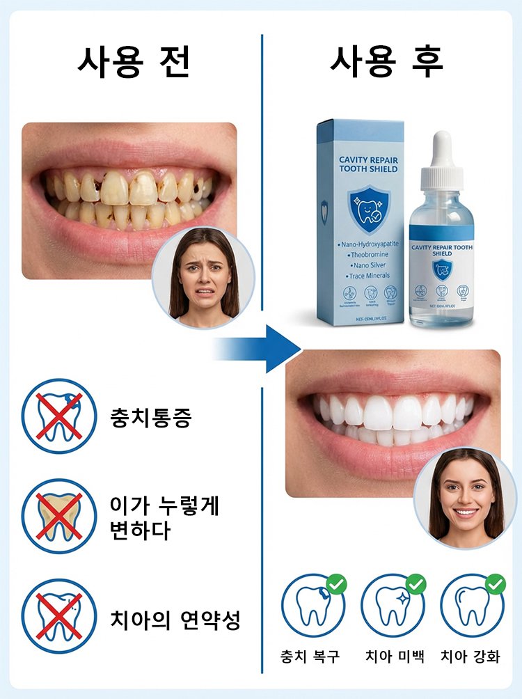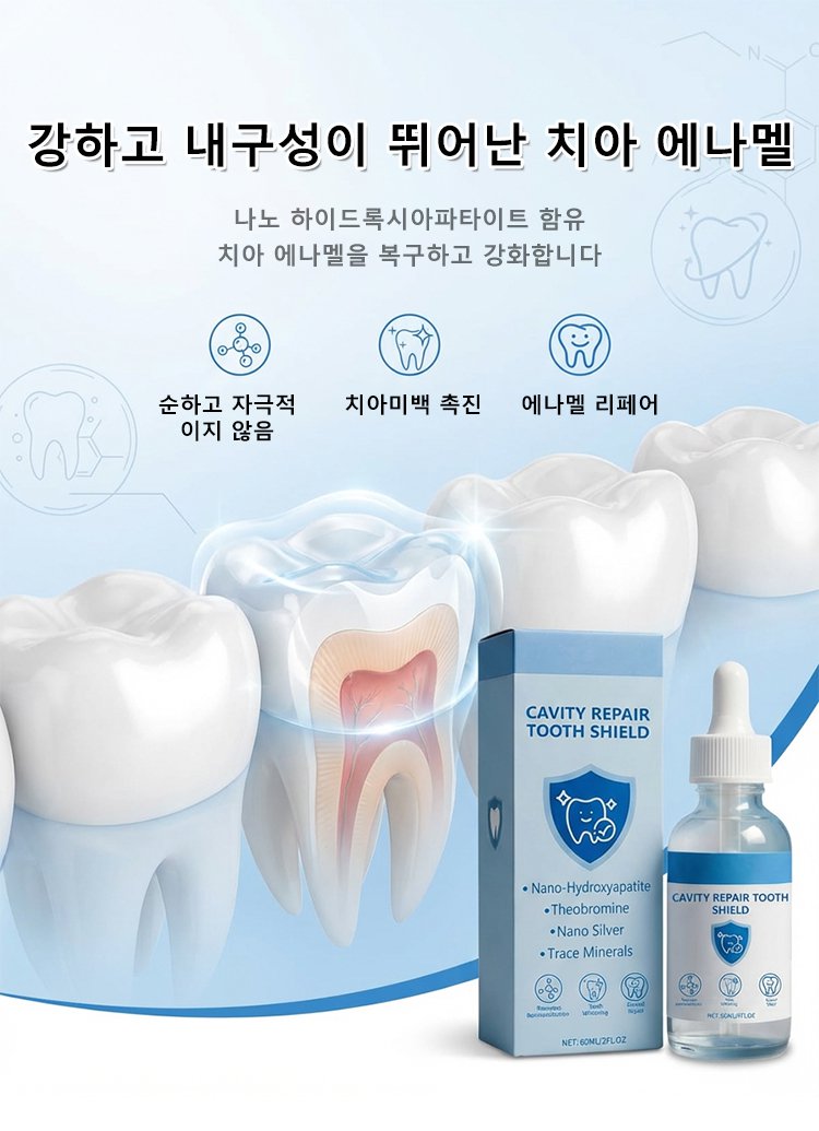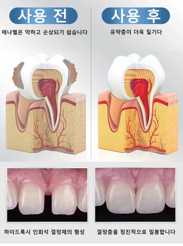 인체 에나멜과 동일한 나노 하이드록시아파타이트 성분으로 국제 연구에서 입증된 미세 균열·충치 복구 효과. 에나멜 재생으로 강도와 자연 광택 회복.